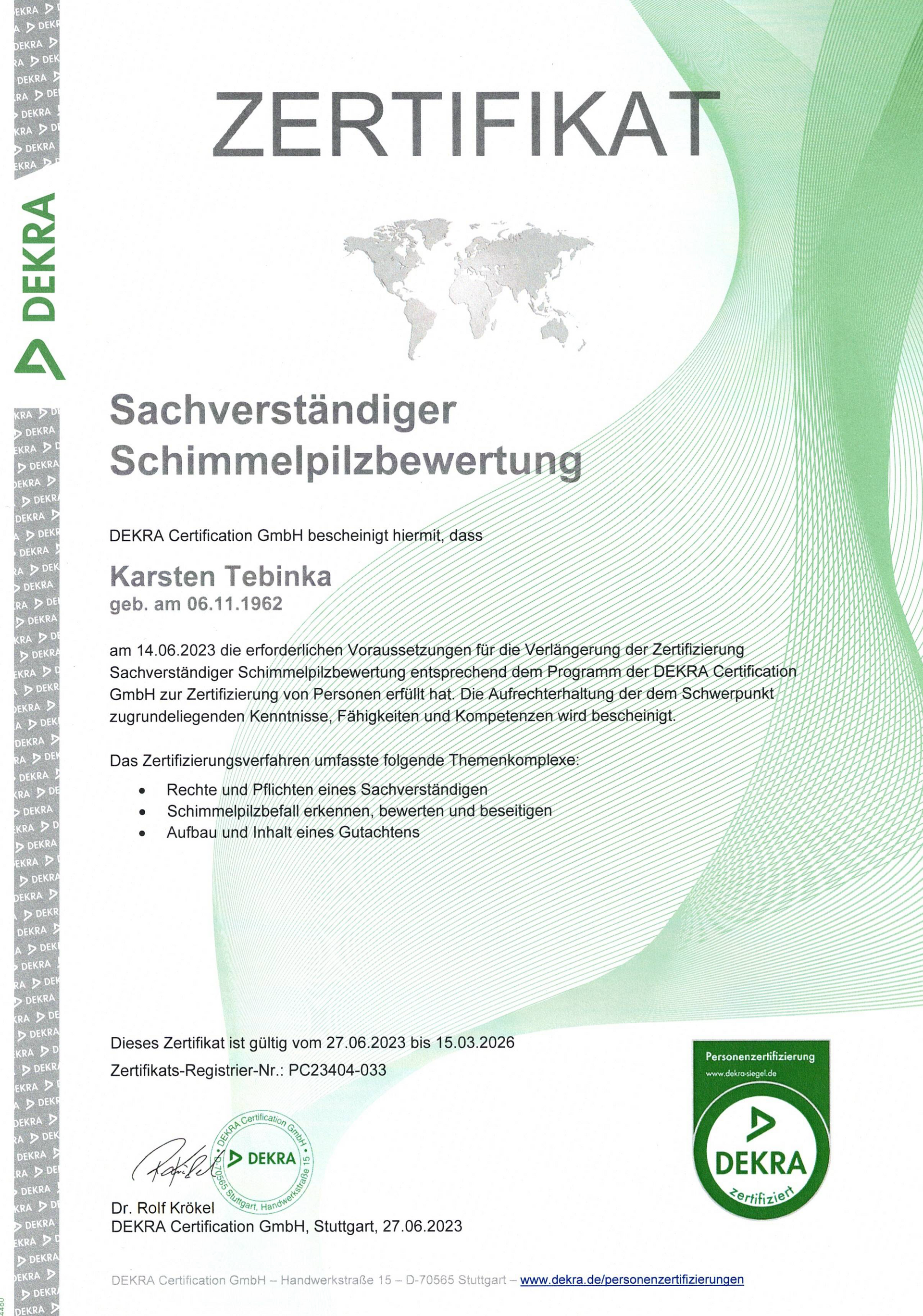 Unsere Schimmelpilzgutachter sind Baugutachter für Schäden an und in Gebäuden und auf die Schimmelpilzbewertung spezialisiert. Ein DEKRA-Zertifikat dient als Nachweis der Sachkunde. Die DEKRA ist eine Prüfgesellschaft im Sachverständigenwesen, die für technische Sicherheit sorgt. Weiterhin verfügen unsere Gutachter über Qualifikationen als Baubiologe IBN sowie als Sachverständiger für Bauwerksdiagnostik, Beurteilung Feuchte- und Schimmelpilzschäden, Zertifizierung DIN EN ISI/EC 17024 2012 (EURO-Zert. Certification).